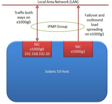 Let me explain this with a diagram. Below is a typical setup of IP multi pathing on a Solaris 10 host. You have two network interfaces or NIC's (Network Interface Cards) that are connected to the LAN. These two interfaces are then placed in an IPMP group. If the interface, that carries the IP fails, then the other interface will take over the ip address and happily continue working.